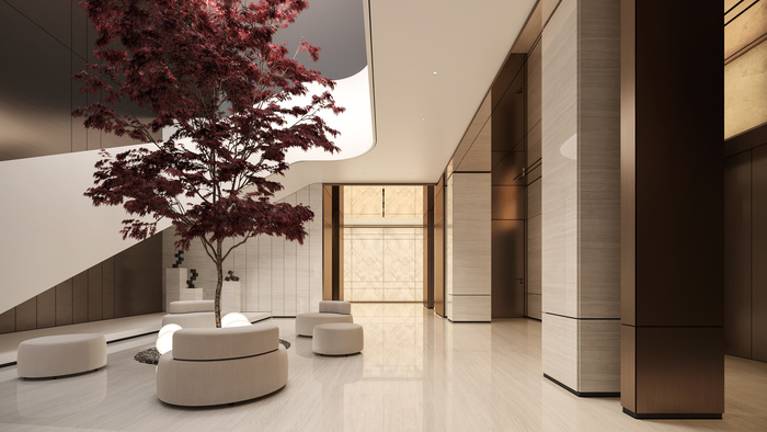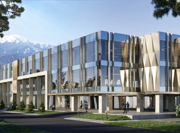 Здание выполнено в современном стиле с использованием натурального камня в отделке фасада. Панорамные окна открывают захватывающие виды на горы, наполняя рабочие пространства естественным светом и подчеркивая премиальный статус объекта.